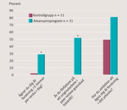 Vi undersökte också en kontrollgrupp avseende forskningsaktivitet och intresse. Denna bestod av samtliga läkarstudenter vid termin 8, Sahlgrenska akademin, Göteborg, som inte ingått i amanuensprogrammet. Totalt 72 procent svarade på enkäten, som redovisas i Figur 3; deltagare i amanuensprogrammet uppvisar betydligt högre forskningsaktivitet än de som aldrig deltagit.