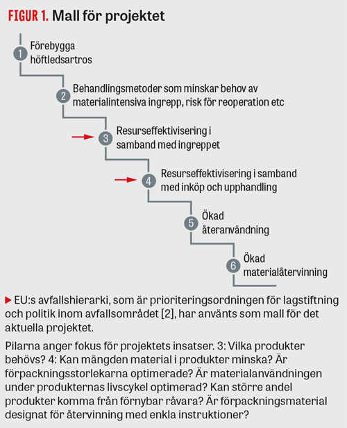 Koncernledningen för hälso- och sjukvård i Västra Götalandsregionen lät mellan 2013 och 2014 genomföra ett projekt med syfte att skapa förutsättningar för framtidens resurssmarta operationer med fokus på minskad produktanvändning. Det primära upplägget kan beskrivas som en observationsstudie initierad ur ett miljö- och resursperspektiv och genomförd i nära samarbete med kliniska företrädare från de inblandade yrkesgrupperna. Utgångspunkten var EU:s avfallshierarki, som anger olika steg för att reducera avfallsmängder [2] (Figur 1), och för projektet utarbetades en modell baserad på en utvald typoperation: »primär total höftprotes (cementerad)«.