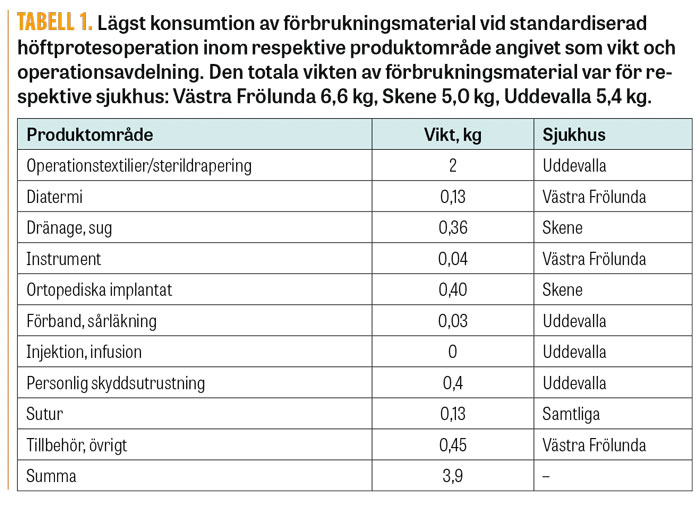 Det aktuella projektet utgick från totalprotesoperation av höftled, som 2016 uppgick till fler än 17 000 ingrepp i Sverige, där cementerad protes är den vanligaste metoden [4]. Resultaten från tre operationsenheter visade en avsevärd variation i användningen av mängden förbrukningsmaterial, från 5,0 till 6,6 kg per operation. Ytterligare ett resultat var att de olika artiklarna var särförpackade, vilket innebar ett stort slöseri med förpackningsmaterial och med arbetstid, då personalen måste öppna dessa förpackningar.