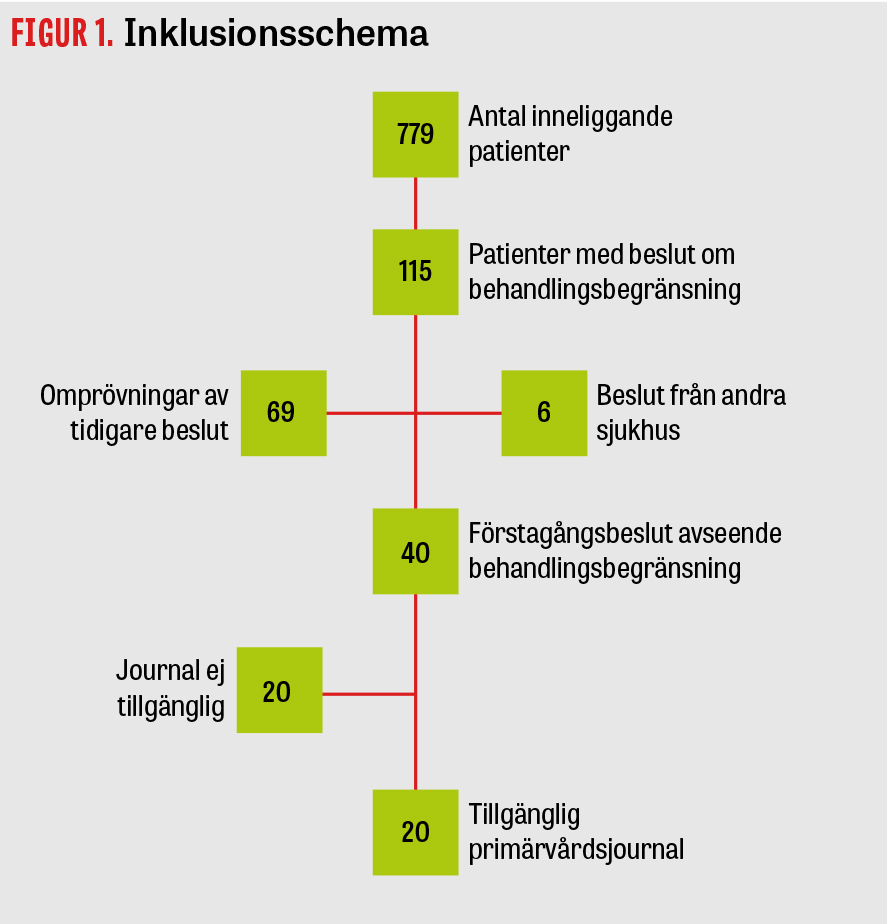 Av de 40 inkluderade patienterna fanns tillgång till primärvårdsjournal enbart för 28 patienter. Av dessa hade 7 patienter sin fasta vårdkontakt inom specialistvården, och journalgranskning i primärvården var således inte tillgänglig. En patient saknade helt tidigare vårdkontakter. Kvarstod således 20 patienter, se Figur 1. 6 av dessa patienter bodde på särskilt boende. 8 hade tillgång till hemsjukvård. 6 bodde i eget boende. Av de 20 patienterna hade 3 beslut om behandlingsbegränsning som ej uppfattades/framkom på sjukhuset. Med en av patienterna hade samtal förts och beslut tagits om att genomföra HLR, vilket ej var känt inom slutenvården. 11 av de 20 inkluderade patienterna bedömdes uppfylla kriterier för beslut om behandlingsbegränsning efter bedömning av studieförfattarna.