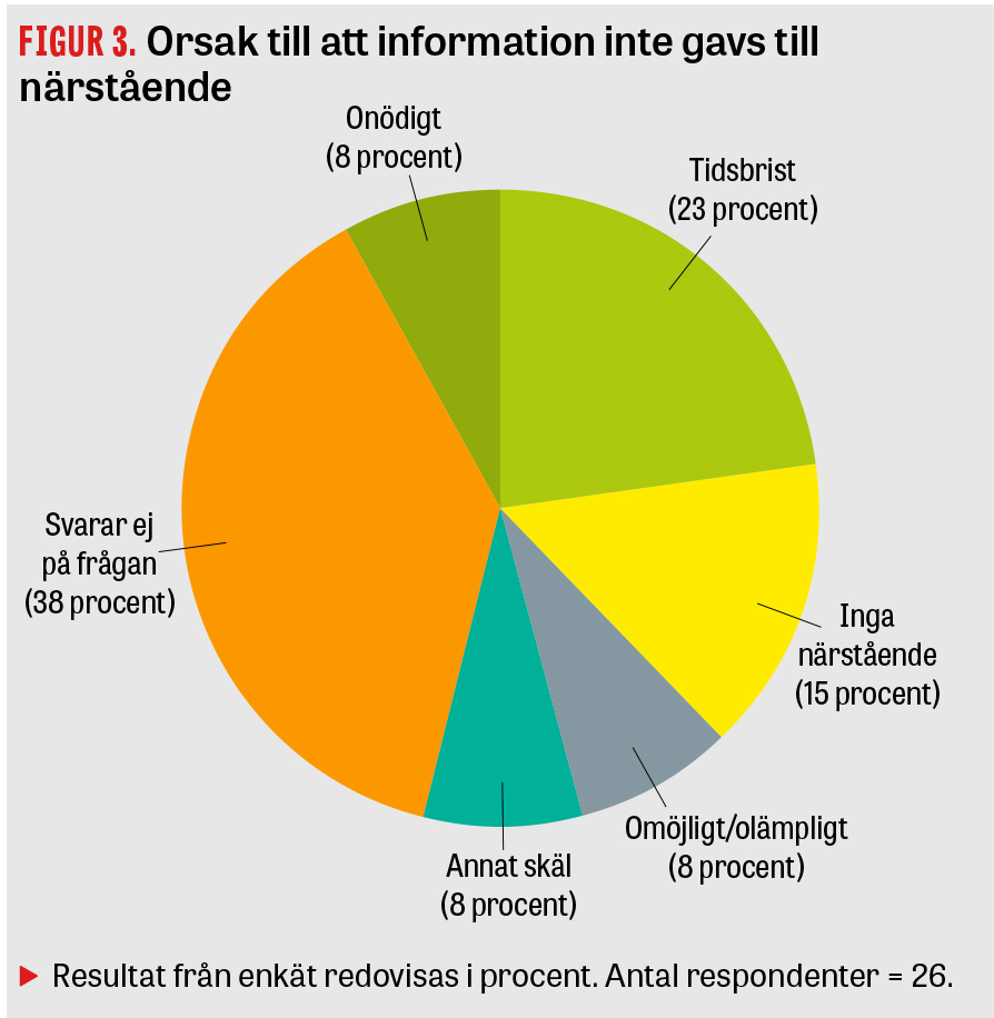 I enkäten uppgav 13 läkare (50 procent) att de inte samrått med patient och heller inte gått vidare och samrått med närstående. Orsakerna till att man avstått kontakten med närstående ses i Figur 3. 5 av de 13 respondenterna avstod att svara på frågan om varför avsteg gjordes.