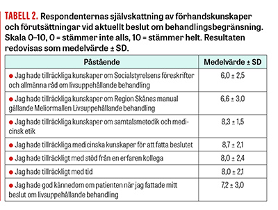 Kritik från Inspektionen för vård och omsorg samt rapportering i medier har kunnat påvisa brister i både beslutsfattande och dokumentation avseende behandlingsbegränsningar [3, 4]. En tidigare studie från Centralsjukhuset Kristianstad har påvisat brister i följsamhet till gällande riktlinjer samt i läkares kunskap om gällande regelverk [5].