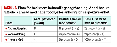 I 17 (43 procent) fall fattades beslut om behandlingsbegränsning redan på akutmottagningen av jourhavande läkare. I 4 (10 procent) fall fattades beslutet på intensivvårdsavdelningen. I resterande 19 (48 procent) fall fattades beslutet på vårdavdelning, se Tabell 1.