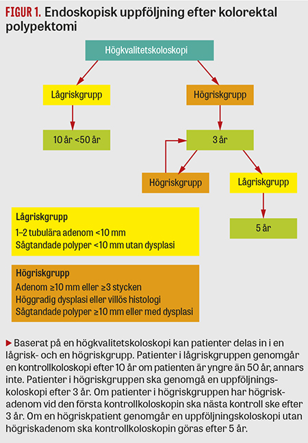 Nyare studier har visat att det är möjligt att dela upp patienter i en lågrisk- och en högriskgrupp med avseende på risk att utveckla kolorektal cancer [16, 17]. Detta är grunden för flera internationella riktlinjer, till exempel de från den brittiska föreningen för gastroenterologi [18] och de senaste från den europeiska föreningen för gastrointestinal endoskopi (ESGE), vilka gavs ut 2013 [19]. De senaste svenska riktlinjerna publicerades 2003 [20]. Vår målsättning är att på uppdrag från Svensk gastroenterologisk förening och Svensk förening för kolorektal kirurgi uppdatera och anpassa dessa riktlinjer till de senaste europeiska riktlinjerna. ESGE:s evidensbaserade riktlinjer utgör grunden till de aktuella riktlinjerna för endoskopisk uppföljning efter polypektomi (Figur 1). I de här riktlinjerna inkluderas inte koloskopikontroller efter borttagande av maligna polyper eftersom dessa patienter alltid ska diskuteras på multidisciplinär konferens.