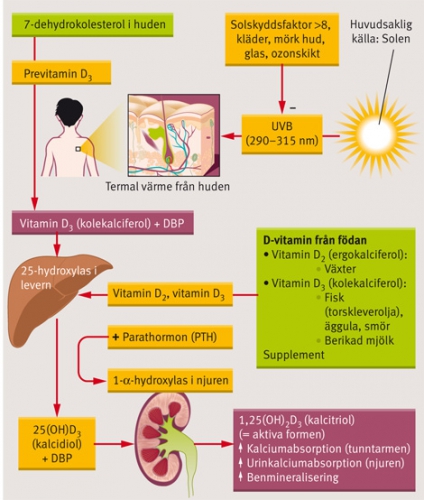 D-vitamindepåerna i kroppen är beroende framför allt av syntesen i huden under inverkan av solljuset och i varierande grad av tillförseln via kosten. Med tanke på vårt lands nordliga läge kan suboptimalt D-vitaminstatus utgöra ett problem i befolkningen. Detta gäller framför allt de grupper som får för lite solljus eller har för lågt D-vitaminintag via kost eller tillskott.