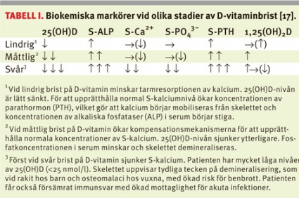 Tabell I visar förändringar av olika markörer vid minskade D-vitaminkoncentrationer. Sammantaget talar resultaten för att lägre serumnivåer av 25(OH)D än 50 nmol/l är suboptimala eller utgör ett bristtillstånd. Denna nivå definieras som nedre gräns för tillräcklig D-vitaminkoncentration för barn av de flesta experter [17, 22-24]. Många anser att koncentrationen av 25(OH)D borde ligga över 80 nmol/l [25, 26], eftersom PTH först vid denna koncentration når ett lägsta värde [27]. Amerikanska Institute of Medicine (IOM) har nyligen satt gränsen för D-vitaminbrist vid <50 nmol/l. Vetenskapligt underlag för att rekommendera 25(OH)D >80 nmol/l för barn saknas för närvarande.
