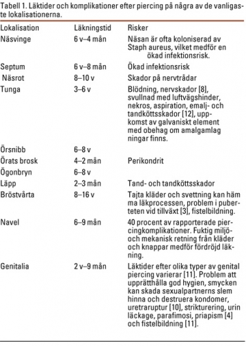 Läkningstiden efter ingreppet varierar med lokalisationen av piercingen (Tabell I). Generellt läker det sämre i brosk på grund av dålig vaskularisering samt i täckta områden där det skaver och miljön är fuktig. Om infektion uppstår kan det krävas antibiotika.
