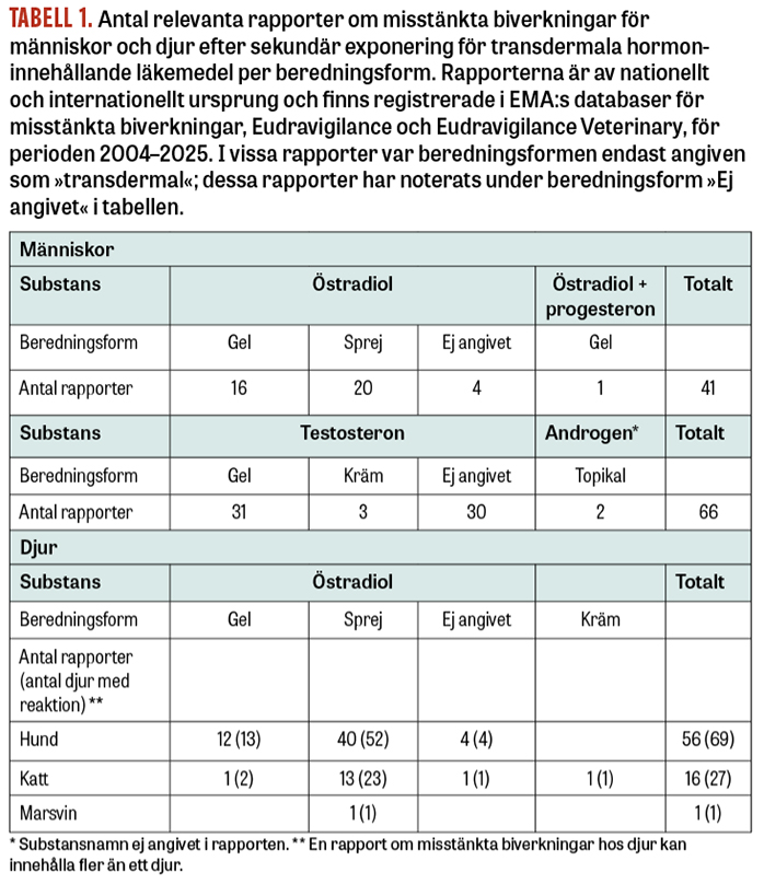 Läkemedelsverket har mottagit 35 rapporter om misstänkta biverkningar efter sekundär exponering för hormonläkemedel (gel, sprej och kräm) hos totalt 49 hundar, katter och marsvin sedan 2019 (Tabell 1). De misstänkta biverkningarna var relaterade till exponering via hudkontakt med djurägare som var under behandling med östrogen i sprejform. Uppvisade symtom var bland annat extrema löpbeteenden trots kastration (ovariehysterektomi), nedsatt tillväxt, missbildningar och dödfödsel hos kattungar, alopeci, ledsmärta, trombocytopeni, leukopeni, nedsatt allmäntillstånd, utvecklade och inflammerade juver hos hanungar och underutveckling eller avsaknad av testiklar. Ytterligare 38 relevanta rapporter för totalt 48 hundar och katter påvisades i EMA:s databas (Tabell 1).