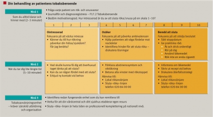 En motiverad rökare är en viktig förutsättning för att avvänjningen ska lyckas. Därför hör motivationshöjande arbete till de färdigheter som en behandlare har nytta av i den kliniska vardagen. »Motivational interviewing« är en metod som används för att mobilisera rökarens egna krafter. Metoden har visat sig vara värdefull i arbetet med alkoholmissbrukare och på senare tid även vid rökavvänjning [5]. För att kunna tillämpa metoden fullt ut krävs utbildning och en hel del träning. »Rapid engagement« är en förenklad variant skapad av samma författare för att utforska och mobilisera rökarens motiv och möjligheter att sluta röka. Det är även här för tidigt att uttala sig om metodens nytta, men många kliniker tilltalas av enkelheten och av hur metoden avdramatiserat rökstoppsrådgivningen. I Figur 1 visas Läkarförbundets och Svenska Läkaresällskapets förslag till hur tobaksberoende patienter ska bemötas och behandlas.