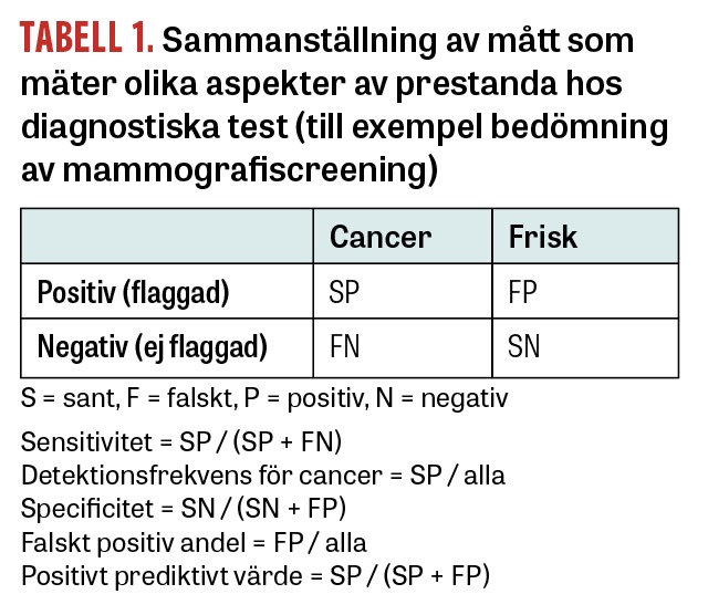 Hur väl AI-systemen presterar kan mätas på olika sätt. Att mäta den diagnostiska förmågan med ett enda mått är oftast inte tillräckligt. Exempelvis finns måttet träffsäkerhet (balanced accuracy), vilket motsvarar andelen av AI-systemets bedömningar som är korrekta. Problemet är att prevalensen av bröstcancer vid screening är låg: endast cirka 0,5 procent av undersökningarna motsvarar en diagnos i Sverige. Träffsäkerheten blir då väldigt hög, (99,5 procent) om AI-systemet skulle bedöma alla undersökningar som negativa, det vill säga avsaknad av cancermisstanke, men samtidigt skulle systemet inte bidra med någon som helst nytta. Därför bör man uppvisa åtminstone två olika mått som avspeglar hur AI-systemet bidrar till upptäckten av cancer (sant positiva) och hur det bidrar till onödiga flaggningar (falskt positiva), som leder till både oro och ökad arbetsbelastning vid efterföljande konsensusdiskussion. Mått som avspeglar förmågan till upptäckt av cancer är antingen sensitivitet eller cancerdetektionsfrekvens, medan mått som avspeglar förmågan att undvika falskt positiva bedömningar är specificitet eller falskt positiv andel (Tabell 1). Positivt prediktivt värde (PPV) är ett mått som kan sägas avspegla effektiviteten hos screeningsystemet genom att det visar hur många fall av cancer man upptäcker som andel av antalet flaggningar. Till skillnad från övriga mått är sensitivitet och specificitet inte beroende på prevalensen av en sjukdom, men har nackdelen att det är teoretiskt omöjligt att vara helt säker på vilka kvinnor som saknade cancer vid tidpunkten för mammografin eftersom de som anses friska inte biopseras.