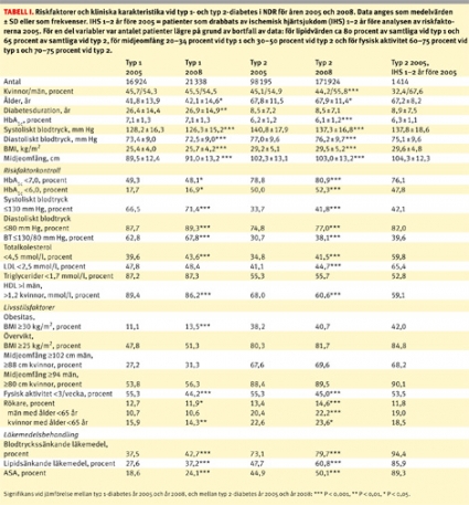 Sammanfattningsvis kan man konstatera att riskfaktorkontrollen av HbA1c, blodtryck och lipider har förbättrats påtagligt över tid hos patienter med typ 1-diabetes, förenat med ökad användning av blodtrycks- och lipidsänkande läkemedel, och att BT ≤130/80 mm Hg uppnåddes av två tredjedelar medan HbA1c <7 procent och LDL <2,5 mmol/l uppnåddes av hälften av patienterna år 2008.