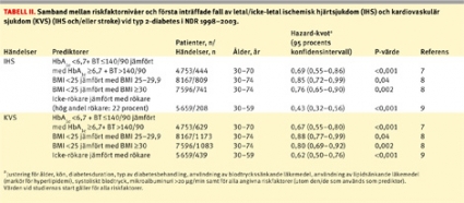Basåret var 1997–1998, och patienterna har i dessa observationsstudier kunnat följas under cirka sex år fram till 2003. Patienter med KVS före basåret har uteslutits vid analyserna. Åldersintervall framgår av tabellen. Diabetesdurationen var i medeltal cirka åtta år. Man ser att den relativa riskreduktionen för IHS och KVS med lägre nivåer för riskfaktorerna varierar från 15 procent vid normalvikt (BMI <25 kg/m2) jämfört med övervikt (BMI 25–29,9 kg/m2) till 57 procent för icke-rökare jämfört med rökare (medelålders 30–59 år med hög andel rökare, 22 procent). Värden för riskfaktorer vid studiestarten har använts för riskberäkningarna, där kombinationen HbA1c <6,7 procent och blodtryck ≤140/90 mm Hg medförde 31 procent lägre risk för IHS och 33 procent lägre risk för KVS.