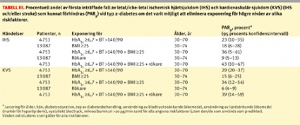 I Tabell III redovisas den partiella riskprocenten som tillskrivs populationen (PARp) för letal/icke-letal IHS och KVS, dvs procent fall av IHS/KVS som kunnat förhindras om det varit möjligt att eliminera exponering för högre värden av olika riskfaktorer [15]. Samma observationsstudier av typ 2-diabetes har använts som i Tabell II. PARp för IHS och KVS varierade mellan 6 och 43 procent för olika riskfaktorer. Högsta PARp för IHS, 43 procent, ses för en situation om samtidigt både HbA1c ≥6,7 procent, blodtryck >140/90 mm Hg, övervikt och rökning vid studiestarten hade kunnat elimineras. Det bör också noteras att PARp är 15–18 procent för IHS/KVS om övervikt och obesitas kunnat ersättas med normalvikt, vilket utgörs av en effekt av BMI som är oberoende av ett flertal andra riskfaktorer vilka justerats för.