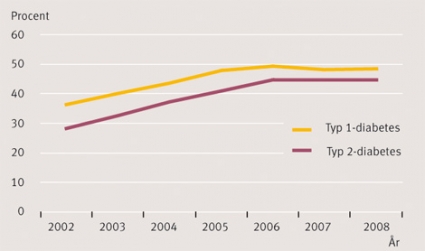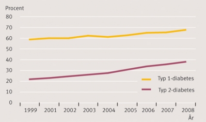 Vid typ 1-diabetes [5], nästan samtliga patienter behandlade på sjukhus, var medelåldern 42 år och diabetesdurationen 26–27 år. Vid jämförelse av år 2005 och 2008 ses följande trender: oförändrat medelvärde HbA1c 7,1 procent; cirka hälften uppnådde HbA1c <7 procent, medan bara en femtedel nådde HbA1c <6 procent. Med ökande bruk av blodtryckssänkande läkemedel ses också en viss sänkning av medelvärdet för blodtrycket och en ökning av andelen som nådde blodtrycksmålet ≤130/80 mm Hg (68 procent 2008). Med ökande bruk av lipidsänkande läkemedel ses i fråga om lipiderna en tydlig ökning av andelen som nådde målet för totalkolesterol, medan cirka hälften uppnådde LDL-kolesterol <2,5 mmol/l år 2008. De flesta nådde målen för triglycerider och HDL-kolesterol. Behandling med ASA ökade något men var relativt ovanlig (19–24 procent). Beträffande livsstilsfaktorer ses en positiv bild med endast 11–14 procent obesa, en tredjedel med förhöjt midjeomfång, 12–13 procent rökare, och hälften angav motion tre eller fler gånger per vecka.