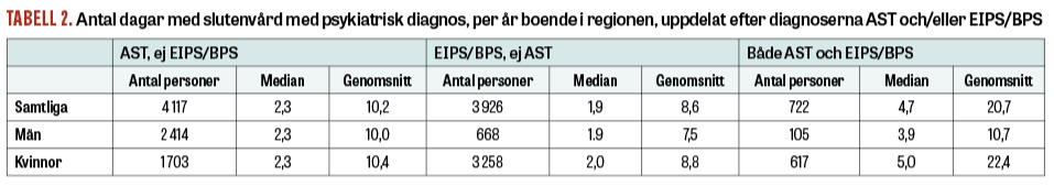 För personer med antingen AST eller EIPS/BPS var antalet dagar med slutenvård med psykiatrisk diagnos ganska lika, med en median på 2 dagar och ett genomsnitt kring 8–10 dagar per år (Tabell 2). Personer med båda diagnoser hade däremot dubbelt så många dagar som de med bara ena eller andra diagnosen, sett till både median (4,7 dagar jämfört med 2,3 hos personer med enbart AST och 1,9 hos individer med enbart EIPS/BPS) och genomsnitt (20,7 dagar jämfört med 10,2 respektive 8,6).