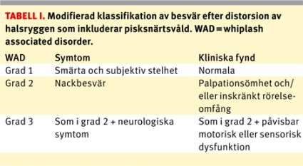 Prevalensen av långvariga besvär efter nackdistorsion varierar stort mellan olika studier. Trots många års forskningsarbete är evidensen beträffande riskfaktorer för pisksnärtsrelaterad skada (WAD; whiplash associated disorder) sparsamma enligt, Neck Pain Task Force [1]. Strukturella förändringar är svagt relaterade till smärtans intensitet, funktionsförmåga och andra symtom [2]. En upp till 5-faldig riskökning för WAD har beskrivits [3] hos personer med