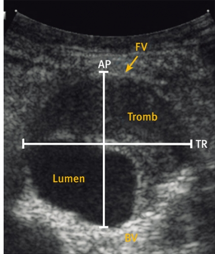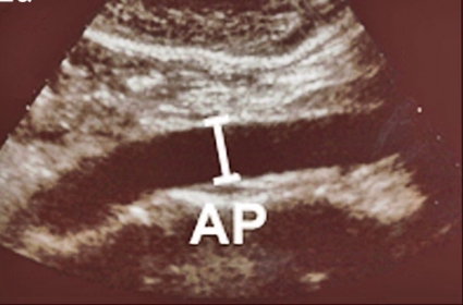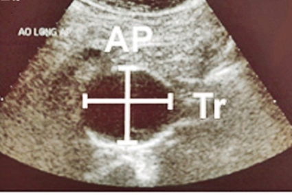 Ultraljudsundersökningen vid screening (Figur 2) skiljer sig från en fullvärdig aortaundersökning såtillvida att dess primära syfte är att med hög säkerhet utesluta sjukdom. Vid screening läggs transduktorn i kärlets längsriktning (Figur 2 a) och maximal infrarenal anteroposterior diameter mäts enligt principen »leading edge to leading edge« (Figur 3). Måttet anges på ett protokoll, som också innehåller uppgifter om eventuella visibilitetsproblem samt undersökarens initialer. Vid diameter ≥25 mm anges också diametern med transduktorn vinkelrätt mot kärlet (Figur 2 b).