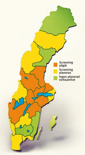 Det innebär att över 90 procent av Sveriges 65-åriga män kan vara inkluderade i ett screeningprogram 2010. Sverige kommer då att vara först i världen med en (näst intill) nationell täckning (Figur 4). Det är viktigt att påpeka att i några län där screening nu planeras kommer det inledningsvis att ske i studieform och att politiska beslut att långsiktigt införa screening ännu inte har fattats i dessa län.