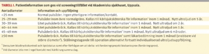 De undersökta personerna får besked direkt av de biomedicinska analytikerna enligt ett standardiserat sätt (Tabell I). De första åren fick samtliga personer med positiva fynd (≥25 mm) besked per telefon eller brev av ansvarig läkare. Numera kallas alla med ett screeningupptäckt bukaortaaneurysm till en sköterskebaserad mottagning för information om sjukdomen samt kompletterande undersökningar (blodtryck, ankeltryck, blodfetter och forskningsprov). I samråd med kärlkirurg inleds, vid behov, sekundärpreventiv behandling och rökavvänjning. Patienter med stora bukaortaaneurysm (≥50 mm) träffar också en kärlkirurg för diskussion om eventuell operativ åtgärd.