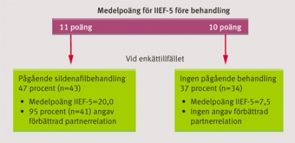 Klar förbättring av partnerrelation och erektion. Vid tidpunkten för uppföljningen hade poängsumman för IIEF-5 förbättrats från i medeltal 11,0 till i medeltal 20,0 (förbättringen varierade från –2 till 15) hos de 43 patienter som fortfarande använde sildenafil. Majoriteten av dessa (95 procent) ansåg också att relationen till partnern förbättrats. Hos de 34 som avbrutit behandlingen men som fortfarande hade behandlingskrävande erektil dysfunktion sågs en försämring av medelvärdet av IIEF-5 från i medeltal 10,0 till i medeltal 7,5 poäng (försämringen varierade från –9 till 2), och relationen till partnern hade inte förbättras (Figur 1).