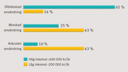 Totalt 81 procent (17/21) från hushåll med låg inkomst angav att de skulle återuppta eller öka sin användning om läkemedelsrabatten återinfördes. För majoriteten (65 procent) med hög inkomst spelade behandlingskostnaden ingen roll, men 50 procent (10/20) skulle återuppta eller öka användningen om rabatteringen återinfördes.