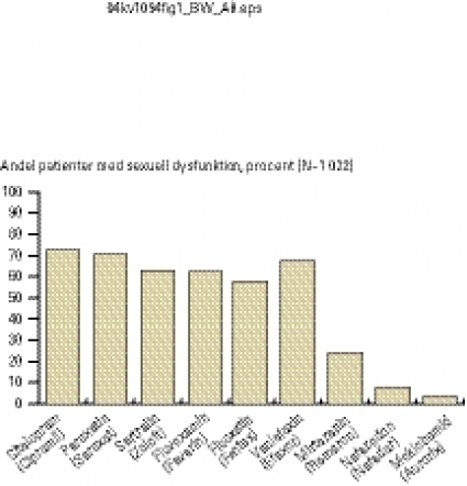 I en spansk studie [1] omfattande 1022 öppenvårdspatienter jämfördes ett flertal antidepressiva medel avseende förekomst av sexuella biverkningar (Figur 1). Enligt denna studie gav SSRI och venlafaxin upphov till mycket högre frekvens av sexuell dysfunktion än nefazodon och moklobemid. Mirtazapin placerade sig någonstans i mitten, trots att dess farmakologiska verkningssätt (postsynaptisk 5-HT2-blockad) teoretiskt sett borde orsaka låg frekvens av sexuella biverkningar. En möjlig förklaring kan vara att substansen blockerar även 5-HT2C-receptorn och ger en viss a1-adrenerg stimulering. Nedsatt lust och fördröjd orgasm/ejakulation var de vanligast förekommande sexuella biverkningarna hos samtliga antidepressiva läkemedel i studien. För SSRI varierade biverkningsfrekvensen mellan 48 och 64 procent. Erektil dysfunktion var inte lika vanligt, vilket indikerar att detta medieras av andra substanser än serotonin.