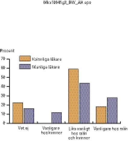 Skillnad mellan kvinnor och män. Vid en jämförelse av sexuella biverkningar hos män respektive kvinnor skiljde sig svaren mellan manliga och kvinnliga läkare. Majoriteten av de kvinnliga och många (44 procent) av de manliga läkarna ansåg dock att incidensen av sexuella biverkningar är lika vanlig hos män som hos kvinnor (Figur 3).