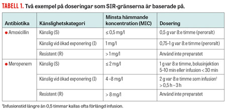 När de nya definitionerna införs betonas att alla brytpunkter (gränsvärden) som används av mikrobiologiska laboratorier för att skilja mellan S, I och R är relaterade till dos och administrationssätt. I EUCAST:s brytpunktstabell beskrivs i den sista fliken de doser och administrationssätt som anses relevanta i förhållande till de brytpunkter som nu används över stora delar av världen. Man måste, för att rätt utnyttja ett resistensmönster, känna till hur man ökar förekomsten av antibiotika i infektionshärden. Man kan behöva konsultera sina kollegor inom klinisk mikrobiologi eller infektionsmedicin för att ytterligare reda ut vad det nya systemet erbjuder och innebär. Detta kan låta onödigt krångligt, men strategin att vid minsta osäkerhet lämna gamla, fortfarande användbara preparat till förmån för nya »säkrare« bredspektrumpreparat är problematisk och ett av skälen till att resistensutvecklingen på många håll skenat iväg. Det räcker inte att endast välja rätt preparat, utan det krävs även rätt dos, doseringsintervall och i förekommande fall även förlängd infusionstid. Exempel med det perorala preparatet amoxicillin och det intravenösa preparatet meropenem visas i Tabell 1.