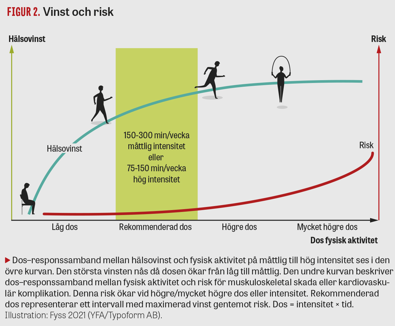 Generellt gäller att vinsterna med fysisk aktivitet enligt rekommendationen är påtagligt större än riskerna. Vid regelbunden fysisk aktivitet på måttlig intensitet är riskerna mycket låga. Muskuloskeletala skador är vanligare än kardiovaskulära komplikationer, som dock kan vara av allvarligare natur [29, 46]. Riskökning ses framför allt vid en högre dos eller intensitet (Figur 2). Vid rådgivning om fysisk aktivitet bör individens hälsotillstånd samt aktivitetens relativa intensitet beaktas. Gradvis ökning av intensitet/dos kan minska eventuella risker, och speciellt vid ordination av fysisk aktivitet på hög intensitet bör dosen initialt vara lägre än vad som kan ge optimal effekt. Vid regelbunden träning är risken lägre för att drabbas av kardiovaskulära komplikationer.