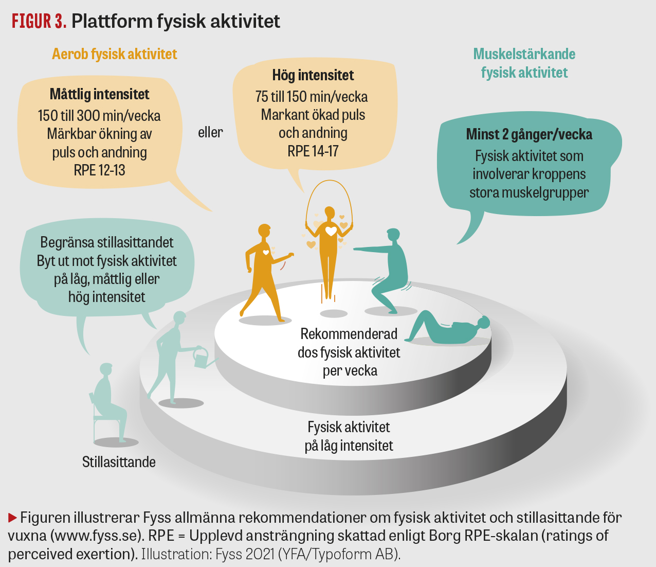 Syftet med allmänna rekommendationer är att tillhandahålla ett tydligt, evidensbaserat budskap till beslutsfattare och medarbetare i hälso- och sjukvården i första hand, men även till befolkningen [1]. I Sverige togs de första allmänna rekommendationerna om fysisk aktivitet fram av Yrkesföreningar för fysisk aktivitet (YFA) år 2001 baserat på en publikation från USA [2]. Där visades att fysisk aktivitet av typ rask promenad på måttlig intensitet kan ge hälsovinster, vilket innebar ett paradigmskifte. YFA:s huvuduppgift är att ta fram både allmänna och diagnosspecifika rekommendationer om fysisk aktivitet samt att publicera kunskapsstödet »Fyss – Fysisk aktivitet i sjukdomsprevention och sjukdomsbehandling« som stöd för hälso- och sjukvården. Både Fyss och rekommendationerna uppdaterades 2021 med bidrag från Socialstyrelsen. De aktuella rekommendationerna bygger på riktlinjer från USA och WHO [3, 4] och har expertgranskats och antagits av Svenska läkaresällskapet. Under 2021 kom även Folkhälsomyndighetens riktlinjer för att främja fysisk aktivitet och minska stillasittandet som ett stöd i folkhälsoarbetet [5], vilka i allt väsentligt överenstämmer med Fyss allmänna rekommendationer.