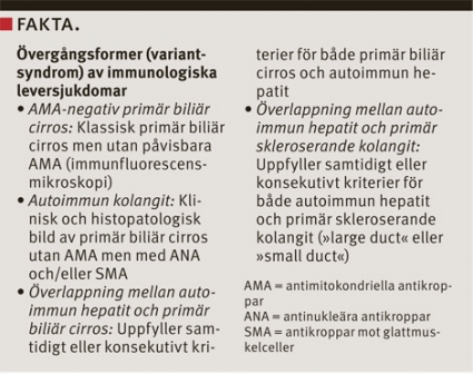 Upprepade leverbiopsier är en förutsättning för att dessa former ska identifieras. Immunsuppression och ursodeoxicholsyra inducerade komplett eller god remission avseende aminotransferaser hos hälften av patienterna. Sannolikt kan andra variantformer av primär biliär cirros än överlappning mellan primär biliär cirros och autoimmun hepatit betraktas som en entitet, och det finns således ingen klinisk anledning att särskilja autoimmun kolangit, AMA-negativ primär biliär cirros och kolestatisk autoimmun hepatit [9].