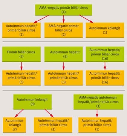 I en annan studie inhämtades uppgifter om alla patienter med kända variantsyndrom av primär biliär cirros i den samlade SILK-PBC-kohorten [8]. Den motsvarar cirka 65 procent av alla patienter med primär biliär cirros i Sverige. I denna population om totalt 800 patienter med primär biliär cirros identifierades 35 (5 procent) patienter med varianter av primär biliär cirros [9]. De utgjordes av 25 patienter med överlappning mellan autoimmun hepatit och primär biliär cirros, 8 med autoimmun kolangit och 2 med AMA-negativ primär biliär cirros. Medeluppföljningstiden för dessa patienter från diagnostillfället var 125 månader. I Figur 1 illustreras hur diagnoserna förändrats över tid.