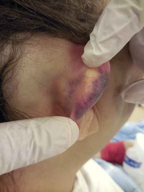 Kvinna som anträffats medvetandesänkt i sin bostad. Förslag till beskrivning: »På det högra ytterörat ses uppskattningsvis 1 cm bred och 3 cm hög blåröd underhudsblödning längs helix.«
