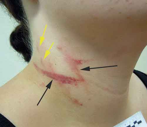 Kvinna som utsatts för bevittnat strypgrepp med händer. Förslag till beskrivning: »På halsens högra sida ses 4 bandformade områden (svarta pilar) med rödaktig missfärgning som i huvudsak utgörs av tätt liggande hudblödningar. Områdena, som i huvudsak är tvärförlöpande, är delvis överlappande. Det tydligaste området är ca 10 cm brett och upp till 1,5 cm högt. I den övre, bakre delen av skadeområdet ses 2 små, bakåt konvexa hudavskrap (gula pilar).«