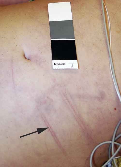 Medvetslös kvinna som inkommit till sjukhus med omfattande skador på kroppen. Den person som ringt efter ambulans kunde inte lämna någon förklaring till vad som inträffat. Förslag till beskrivning: »Lågt till vänster på buken ses inom ett ca 20 cm brett och 10 cm högt område, med centrum 12 cm till vänster om naveln, åtminstone 4 stycken i olika riktningar förlöpande, ca 1 cm breda och 10 cm långa, dubbelkonturerade rödaktiga stråk med hudblödningar. Avståndet mellan konturerna är ungefär 0,4 cm (pil).« Kommentar: Vid dubbelkonturerade skador blir bredden viktig att dokumentera, eftersom den kan härledas till bredden på det föremål som orsakat skadorna.