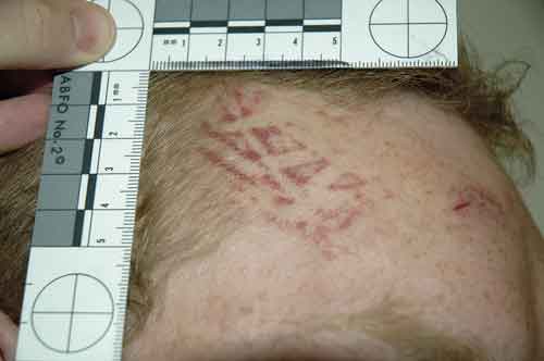 Man som uppgett att han blivit sparkad i huvudet. Förslag till beskrivning: »Till höger i pannan, ca 4 cm ovan det högra ögonbrynets yttre begränsning, ses ett 2 cm brett och 4 cm långt område som förlöper från hårfästet och snett nedåt vänster. I området ses blåröd missfärgning med inslag av mönstring, som utgörs av omväxlande bleka områden och röda hudblödningar i form av bl a trianglar och romber.« Kommentar: Det är av största vikt att dylika mönstrade skador (som har högt bevisvärde) dokumenteras även fotografiskt och med skiss. Dokumentation kan enkelt utföras genom att en plastfilm läggs över skadeområdet och att skadan sedan avritas i skala 1:1 med en tuschpenna.