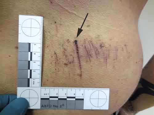 Vid misstanke om skarpt våld (såsom efter knivstick/knivskärning) dokumenteras hudskadans storlek och riktning samt sårkanalens riktning och djup, eventuell förekomst av anslutande sinsemellan parallella, regelbundna, ytliga skador samt eventuella skador på djupare liggande organ.