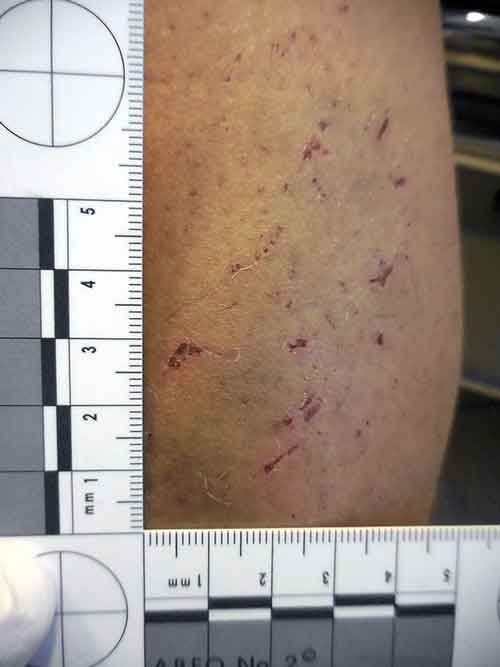 Kvinna som uppgett att hon blivit misshandlad med bl a sparkar. Förslag till beskrivning: »På det vänstra underbenets utsida ses inom ett 4 cm brett och 7,5 cm högt område ett 20-tal ytliga, röda hudavskrapningar som inte täcks av någon sårskorpa. Flera av hudavskrapningarna ligger i grupperingar, och skadeområdet har ett övergripande förlopp uppifrån höger och snett nedåt vänster. De största hudavskrapningarna i området är upp till ca 0,3 cm breda och 1 cm i långa. Inom hela skadeområdet ses diffus ljusblå missfärgning.«