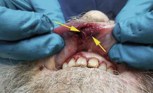 Man med alkoholmissbruk som fått utstå trubbigt våld (knytnävsslag) mot bl a ansiktet. Förslag till beskrivning: »Till höger på överläppens insida ses en ca 1,5 cm i diameter stor sårskada i slemhinnan med oregelbundna sårkanter och förekomst av vävnadsbryggor (pilar) centralt i såret. Intill sårkanterna, och i såret, ses blåaktig missfärgning.«