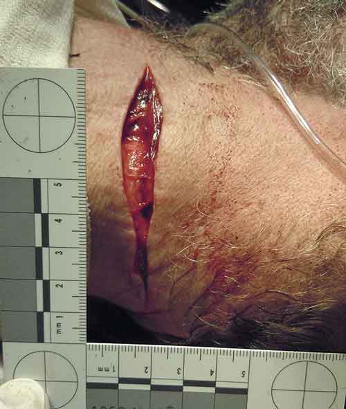 Man som anträffats i sin bostad med en sårskada på halsen. Förslag till beskrivning: »På halsens vänstra sida ses en tvärförlöpande sårskada där sårkanterna är jämna och raka (skarpa) utan omkringliggande besudlingar. I sårskadan, som är 7,5 cm bred och glipar upp till ca 1 cm, ses inga vävnadsbryggor och inget främmande material. Sårskadan går genom hela hudens tjocklek och ser ut att blottlägga muskulatur.« (Observera att »bredden« på skadan anges utifrån anatomisk grundposition.)