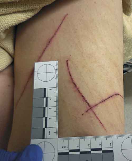 Kvinna som inkommit efter misstänkt våldtäkt och skurit sig själv med flerbladig rakhyvel. Förslag till beskrivning: »På det vänstra lårets framsida ses 3 ytliga skarpkantade sårskador som var och en består av 2 tätt intill varandra belägna, parallella rispor som delvis täcks av torkat blod. Den längsta är 12 cm lång och är belägen på lårets insida, 20 cm ovan knäleden, och förlöper från lårets framsida snett nedåt mot insidan. De andra 2 korsar varandra och är belägna på lårets framsida, 8 cm ovan knäleden.«