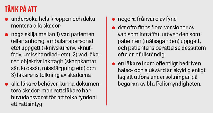 Av 6 kap 9 § patientsäkerhetslagen [1] framgår att läkare som är verksam inom den offentligt bedrivna hälso- och sjukvården är skyldig att utföra undersökningar (och att ge utlåtanden om dessa) på begäran av bl a Polismyndigheten. Alla läkare måste därför kunna dokumentera skador på ett adekvat sätt, även om de inte senare kommer att utfärda rättsintyg.