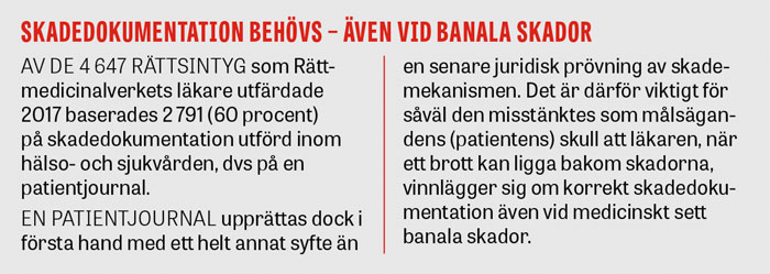 När polis och åklagare utreder ett misstänkt brott där fysiskt och/eller sexuellt våld har förekommit är det ofta betydelsefullt att såväl förekomst som avsaknad av skador på både målsäganden (dvs brottsoffret) och den misstänkte finns dokumenterade på ett rättssäkert sätt. Skadedokumentationen kan sedan ligga till grund för ett rättsintyg och därmed vara en del av en rättslig förundersökning. Eftersom skadedokumentation av rättsläkare förutsätter att händelsen är polisanmäld, blir det ofta en kliniskt verksam läkare som gör denna dokumentation i samband med en sjukvårdande insats.