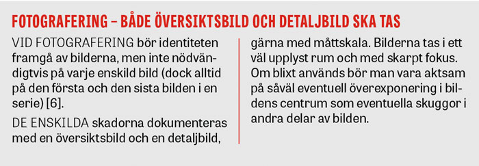 Skadorna kan med fördel ritas in på en kroppsmall. Dessutom kan fotografier av god kvalitet utgöra ett utmärkt komplement till den skriftliga skadebeskrivningen. Såväl en översiktsbild som en närbild av varje skada tas i rät vinkel mot kroppsdelens hudyta, och en mätskala bör synas i bilden. Läkaren måste därför vara förtrogen med arbetsplatsens kamera, och bilderna bör märkas så att de är spårbara både avseende person och fotograferingstidpunkt [6]. Fotografering med privatägd mobiltelefon bör undvikas.