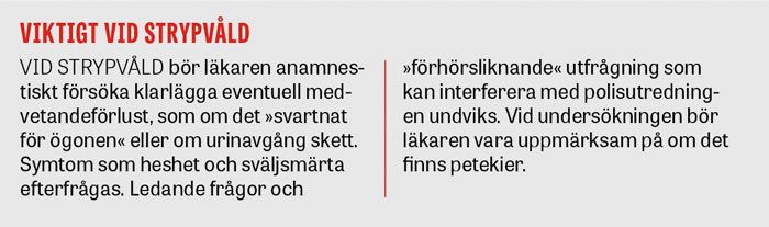 Vid uppgift om våld mot halsen eller där sådan våldsinverkan kan befaras, såsom vid våld i nära relation, bör halsen och ansiktet därför alltid undersökas noggrant.