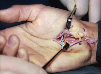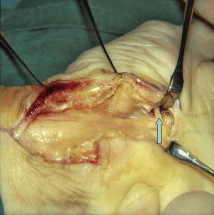 Samtliga patienter opererades med den öppna tekniken. Operationerna utfördes i lokalanestesi. Hudincisionen över karpaltunneln gjordes med ett vinkelformat snitt, bortsett från i fyra fall, där man valde ett rakt snitt. Hos tio av patienterna, dvs i drygt 25 procent av fallen, identifierades den motoriska nervgrenen till tummen (Figur 1 och 2). I 21 fall utfördes operationen av en ortoped, i åtta fall av en handkirurg och vid fem tillfällen av en allmänkirurg. Åtta av operationerna gjordes på universitetsklinik, resten på läns- eller centrallasarett.