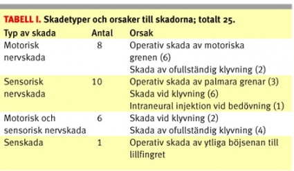 De olika skadetyperna och orsakerna till skadorna anges i Tabell I. Hos åtta av de 25 patienterna som tillerkändes ersättning fanns en motorisk nervskada, hos tio enbart en sensibel skada och hos sex både motorisk och sensibel nervskada. Hos en patient påvisades en skada av den ytliga böjsenan till lillfingret. Den dominerande skadetypen vid den motoriska skadan bestod i en nedsatt oppositions–abduktionsförmåga (sex av åtta) eller uttalad tenaratrofi (två av åtta). Den sensibla nervskadan medförde hos hälften av patienterna en känselnedsättning i kombination med smärta/hyperestesi. Hos de övriga fanns enbart en känselnedsättning i handflatan eller fingrarna.