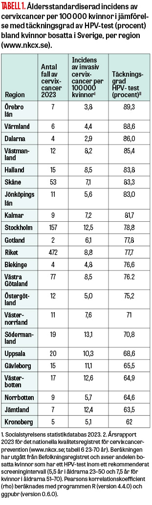 En möjlig förklaring till de höga cancerriskerna efter normal cytologi skulle kunna vara att det säkrare testet (HPV-test) inte erbjudits till kvinnor som nyligen haft normal cytologi. Aktuell täckningsgrad för HPV-test varierar mellan 89 procent och 62 procent bland landets regioner [2] (Tabell 1). Höga täckningsgrader antyder att hela befolkningen i regionen nu troligen erbjudits HPV-test. Den starkare skyddseffekten av HPV-test borde i sin tur resultera i lägre cancerincidens. Betydande variabilitet kan förväntas på grund av litet befolkningsunderlag i många regioner, och variationer i cancerincidens kan förstås bero på många saker. Ändå ses en signifikant korrelation mellan täckningsgrad av HPV-test och cancerincidens (Spearmanns rho =–0,50; P = 0,022) (Tabell 1).