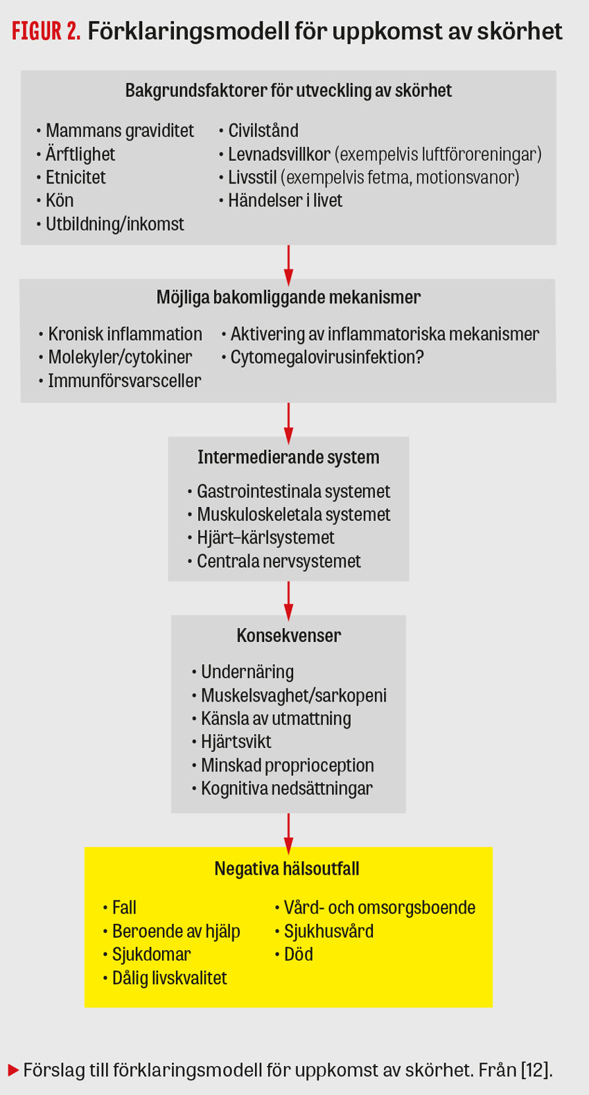 Orsaken till utveckling av skörhet är mångfacetterad och sammanfaller i mycket med åldrandeprocessen. Faktorerna bakom såväl det normala som det accelererade åldrandet vid skörhet är mycket komplexa. Figur 2 illustrerar den patofysiologiska mångfalden [12]. Till exempel spelar åldersrelaterad låggradig inflammation, oxidativ stress och neuroendokrin dysreglering betydande roller i ett intrikat samspel med arv, livsstil, sjukdomar och omgivning [5, 7, 13].
