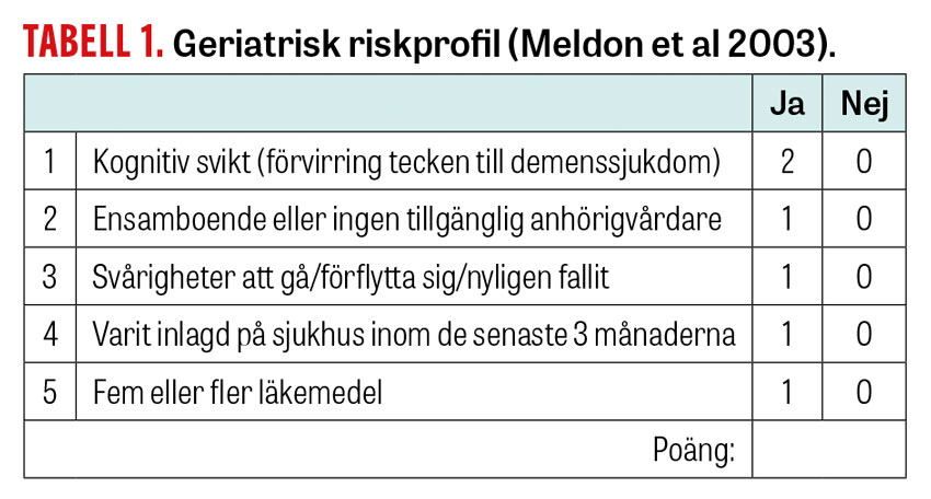 Geriatrisk riskprofil utvecklades som ett triageverktyg för akutmottagningar, först under namnet Triage risk screening tool, och har sedan flera år använts i till exempel Örebro, Kalmar och Sörmland. Verktyget består av 5 frågor (0–6 poäng), och om summan blir ≥3 poäng bedöms patienten vara en geriatrisk riskpatient (se Tabell 1). Eftersom resultatet blir dikotomt, det vill säga antingen skör eller robust, till skillnad från den 9-gradiga Clinical frailty scale, ges mindre vägledning för prioritering. Skalan har även anpassats till att fungera även i primärvården, till exempel i Västerås.